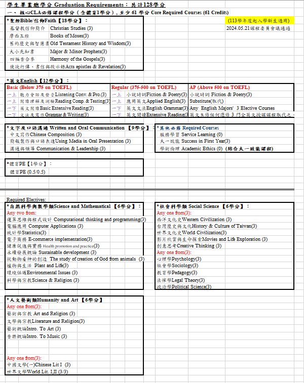 溝通能力包括雙語溝通、數位科技溝通及人際交流溝通等能力。本校核心課程規劃至12學分的英語課程;3學分的中文寫作課程;3學分的溝通與領導課程和3學分的數位電腦相關課程等。 |