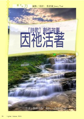新力重 編輯 / 設計: 蔡庭箴 Jenny Tsai 得 因祂活著【詩歌】創作故事 P. 14 作者:微牧之歌 - 林杉 (2016-11- 29) 28 Lighter Autum 2016