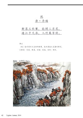 風 唐·李嶠 解落三秋葉,能開二月花。 過江千尺浪,入竹萬竿斜。 譯注 (風)能吹落秋天金黃的樹葉,能吹開春天美麗的鮮花。 ①解落:吹落,散落。②過:經過。③斜:傾斜。 編輯:宗楚佳 Alaina 42 Lighter Autum 2016