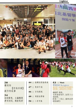 Lighter 28 44 | 勃蘭登堡協奏曲 53 | Music 讚美詩 47 | 牧神午後 46 | 百鳥朝鳳 萊特姐弟 The Lighters 【因他活著】 48 | 部落音樂會 創作的故事 50 | 二手市集 還記得 , 來過我們學校演講的 34 他們嗎?喜歡他們的音樂嗎? 詩詞賞析,主編精選 唐宋詩詞,魏晉風骨 讓我們 最後, 再來看看他們 , 振奮人心 的故事; 回味一下那首 , 韻味盎然 的歌曲吧! 5